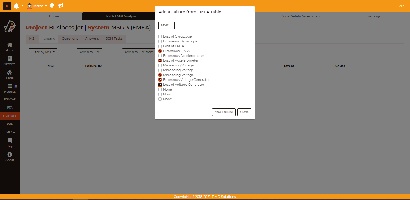 After having added one or more MSI’s, one can move on to the “Failures” tab and click on Add a failure from FMEA Table. From here, you choose the MSI that you would like to assign the failures to, followed by the failures, and finally, you finish by clicking on Add Failure.