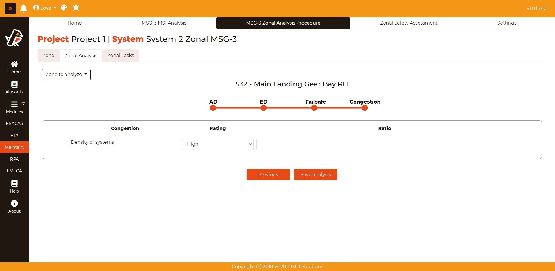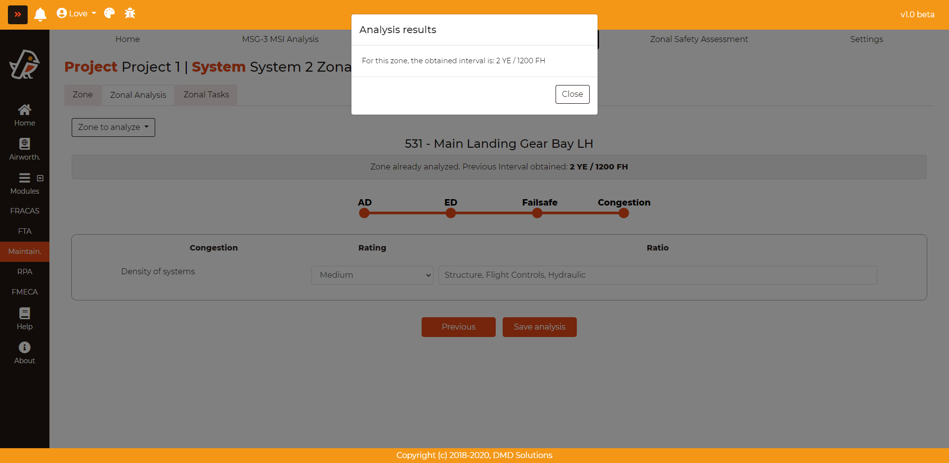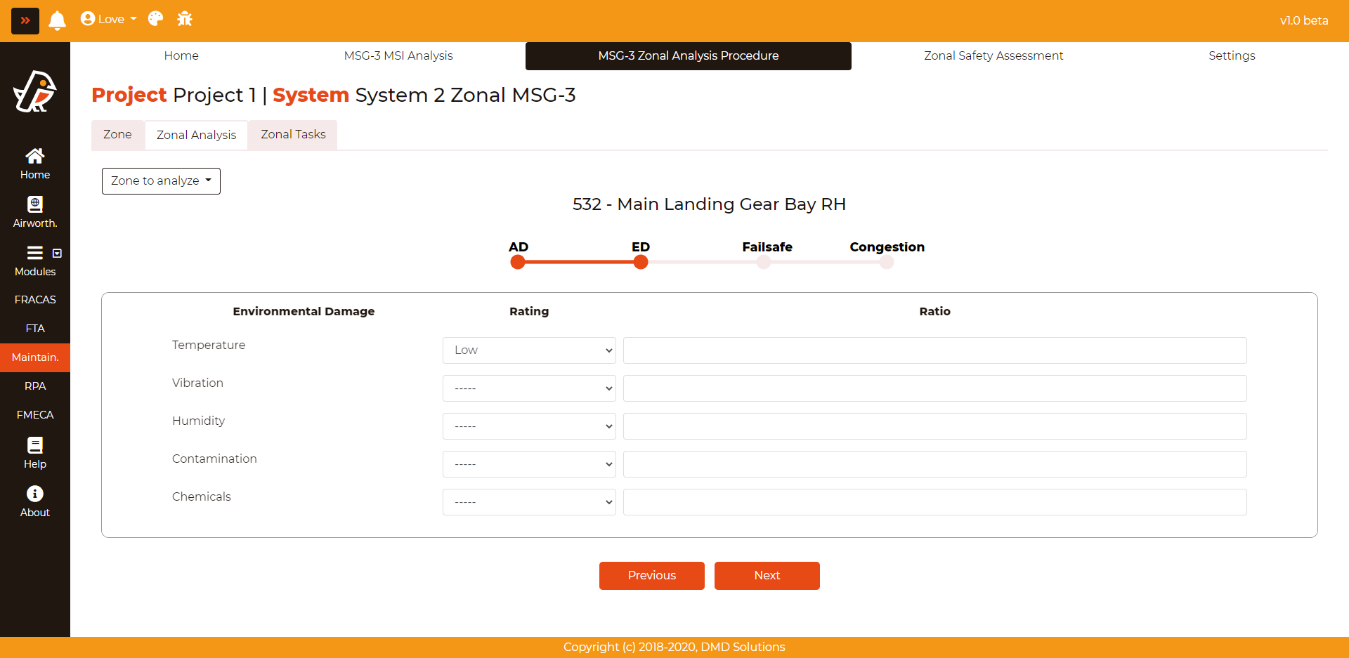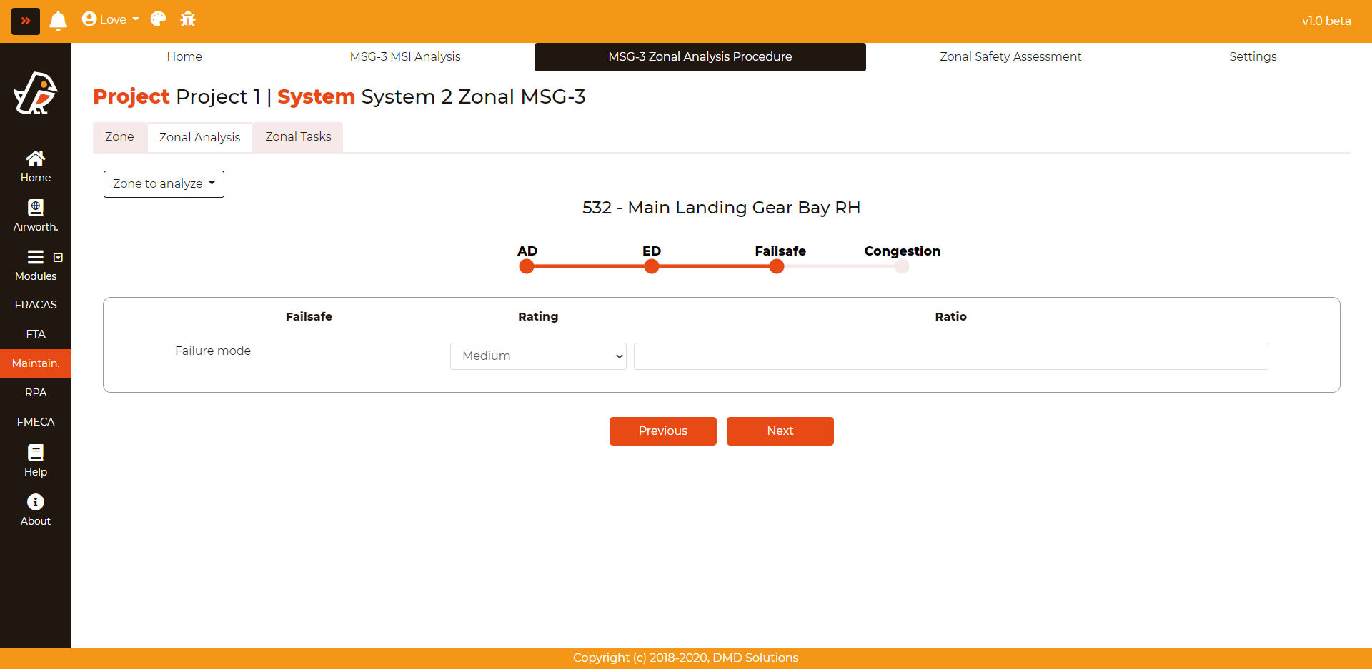 To perform the zonal analysis, go to Maintainability > MSG-3 Zonal Analysis > Zonal Analysis. For each zone, four different analysis are required. After choosing a zone, the user will have to fill four different forms: