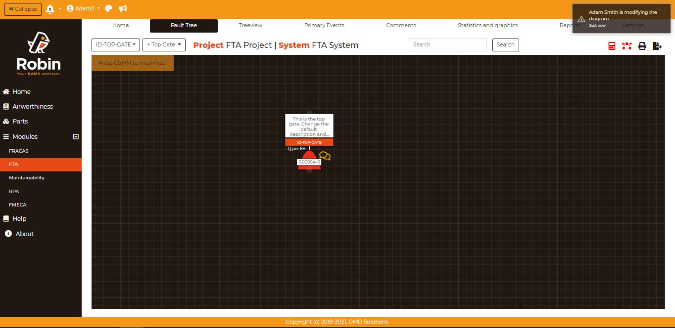 Navigation Status notifies the user when a teammate is online working on the same diagram (e.g., fault tree) or table.